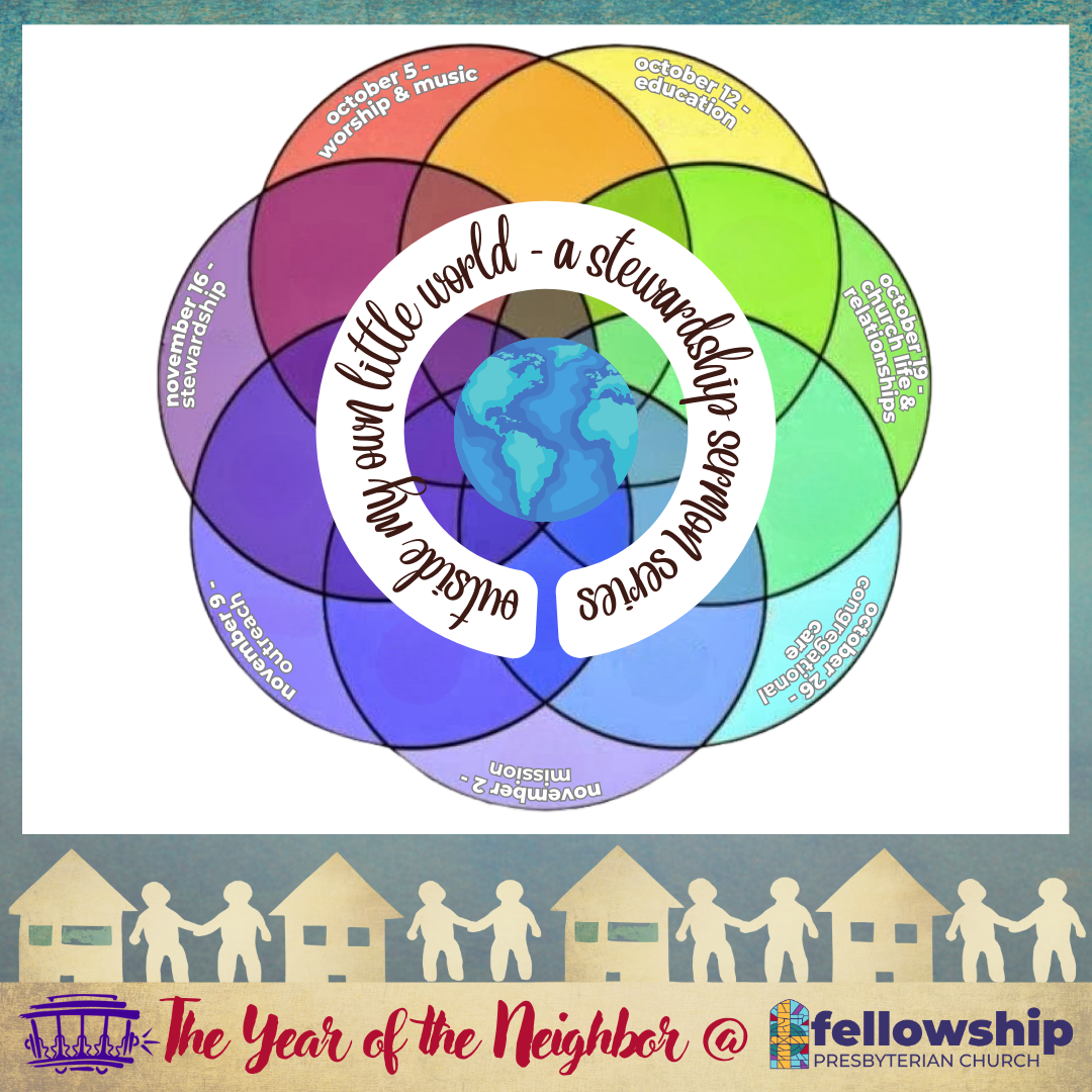 Join us for worship as the gathered body digging into Week 4 of the “Outside My Own Little World” sermon series, focusing on “Congregational Care”, at 10am (in-person and online).