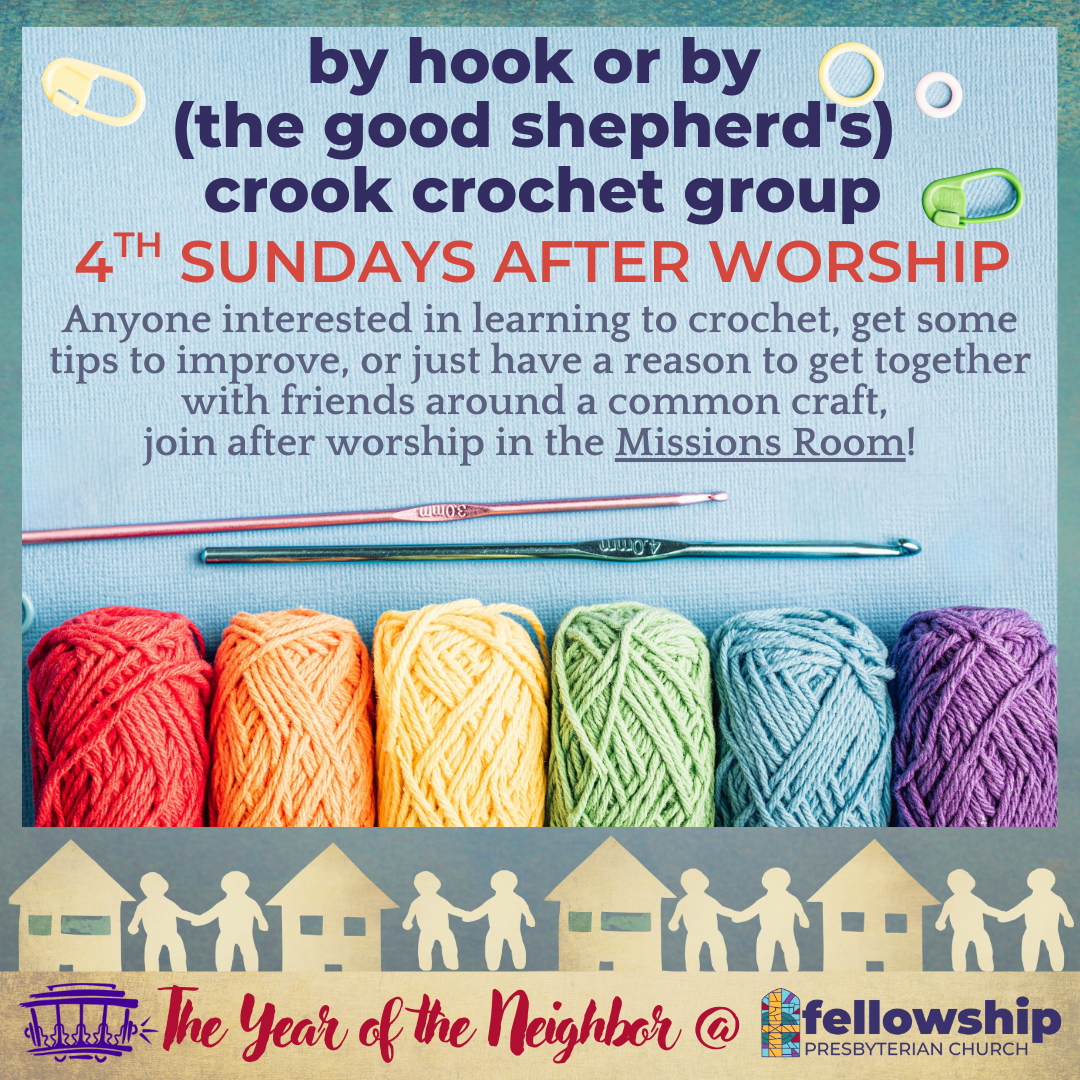 Anyone interested in learning to crochet, get some tips to improve, or just have a reason to get together with friends around a common craft, join after worship in the Missions Room!