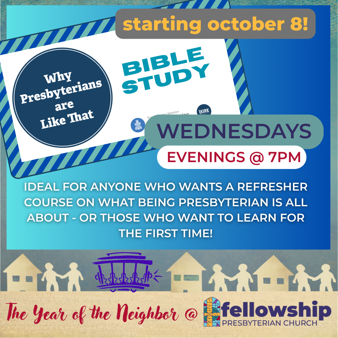 Using the Bible study Why Presbyterians are Like That, written by UKirk and the Office of Christian Formation of the PC(USA) as a guide, the group will discuss the reasons why a denomination does what it does. Childcare available if requested no later than the Sunday prior…