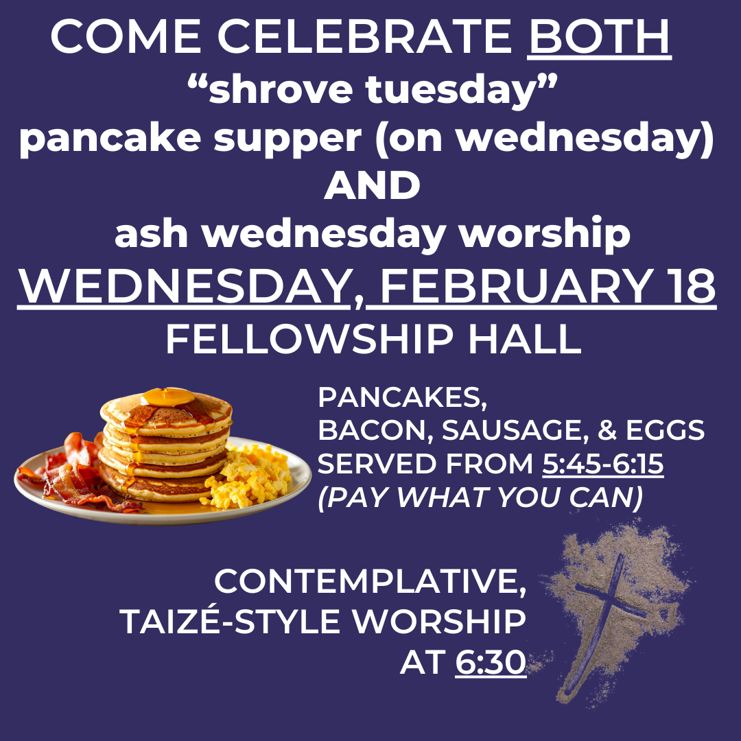 The Lenten journey begins on Ash Wednesday, February 18, with a Pancake Dinner to celebrate Shrove Tuesday (the night before) from 5:45-6:15pm, followed by worship at 6:30pm. Both will take place in the Fellowship Hall. The service will NOT be streamed online; professional childcare will be available.