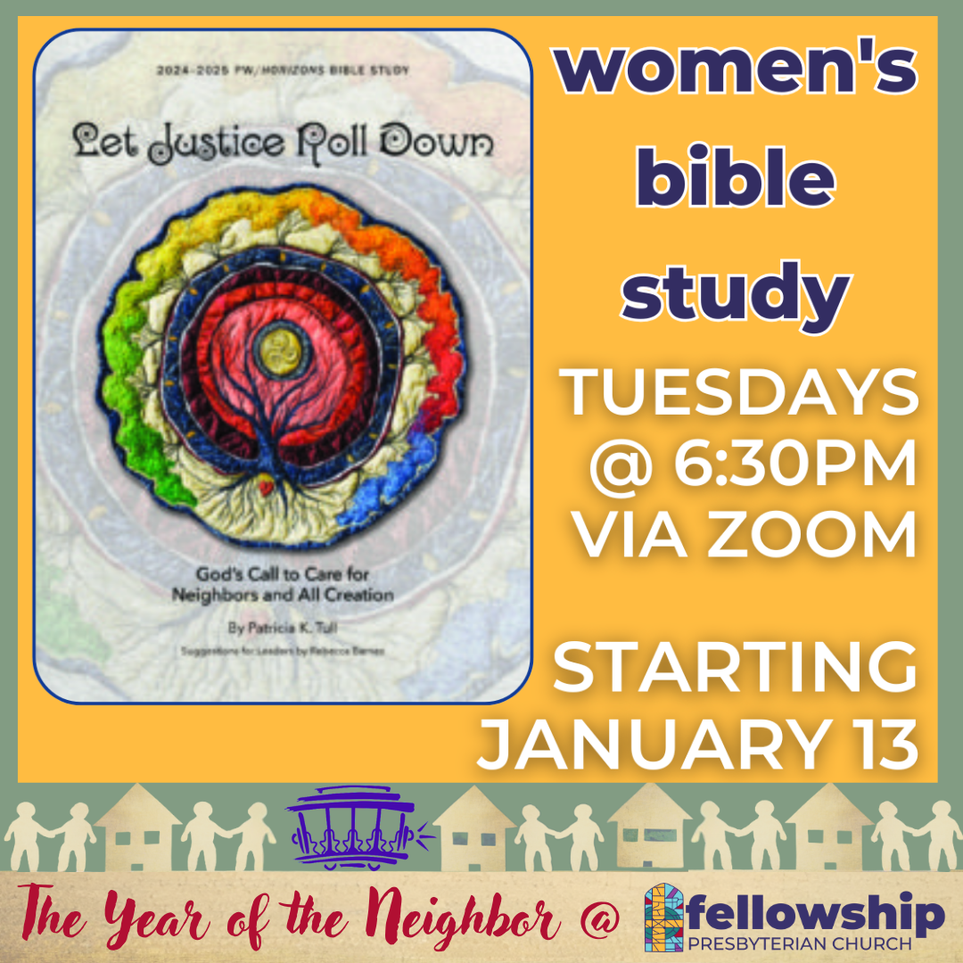 The FPC Women’s Bible Study Is examining a study entitled Let Justice Roll Down: God’s Call to Care for Neighbors and All Creation, which examines ecological systems, climate change, and human-made environmental stress. For more information or to participate, please contact the church office.