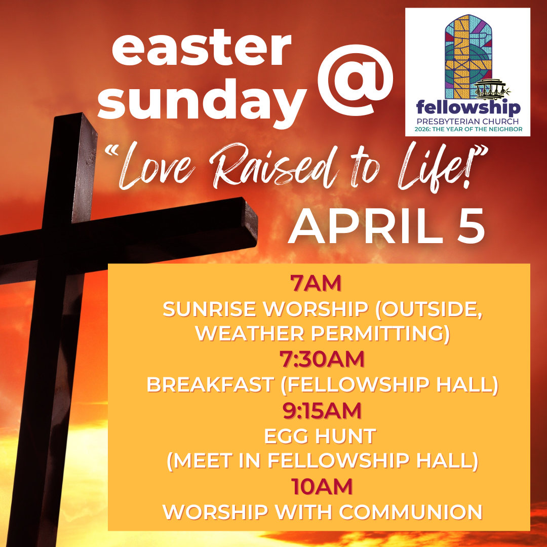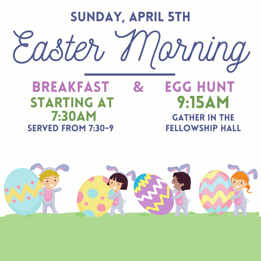 Members of the Fellowship Family will gather to share food and fellowship between the two worship services, starting at 7:30. At 9:15 children up through 5th grade are invited to the Fellowship Hall to participate in the annual egg hunt on the adjoining playground. If the weather is tempermental, the egg hunt will take place throughout the building.