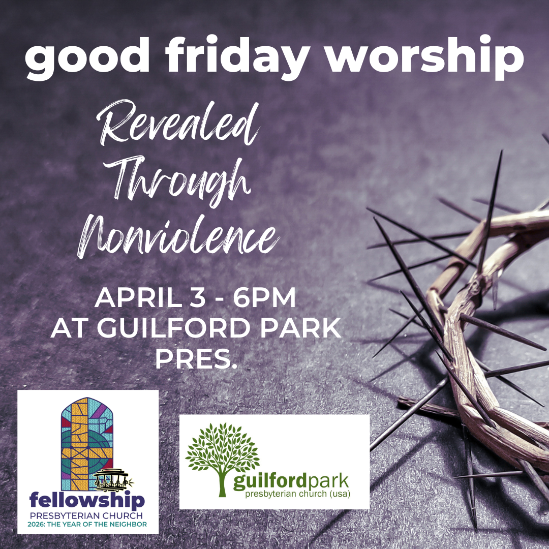 On Good Friday, we continue our Love God, Neighbor, Enemy Sermon Series while worshipping with our friends at Guilford Park Presbyterian Church AT Guilford Park Presbyterian Church (2100 Fernwood Drive). This stop in the Holy Week journey will mark the ultimate betrayal and the ultimate sacrifice. Whether in-person or online, join us LIVE on Good Friday for worship at 6pm in the Sanctuary at Guilford Park Presbyterian Church. Professional Childcare is NOT available for this service.