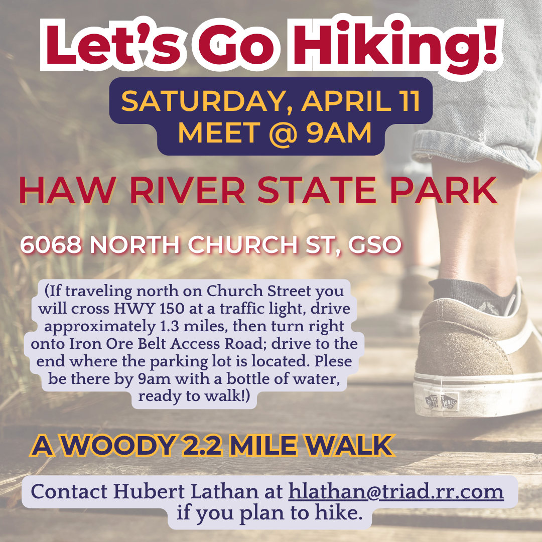 The next Fellowship Hikers event is Saturday, April 11, at 9am. All interested should meet Hubert Lathan at the Haw River State Park parking lot (6068 N. Church Street) to walk a lovely spring 2.2-mile hike. Please email him if you plan to join him!