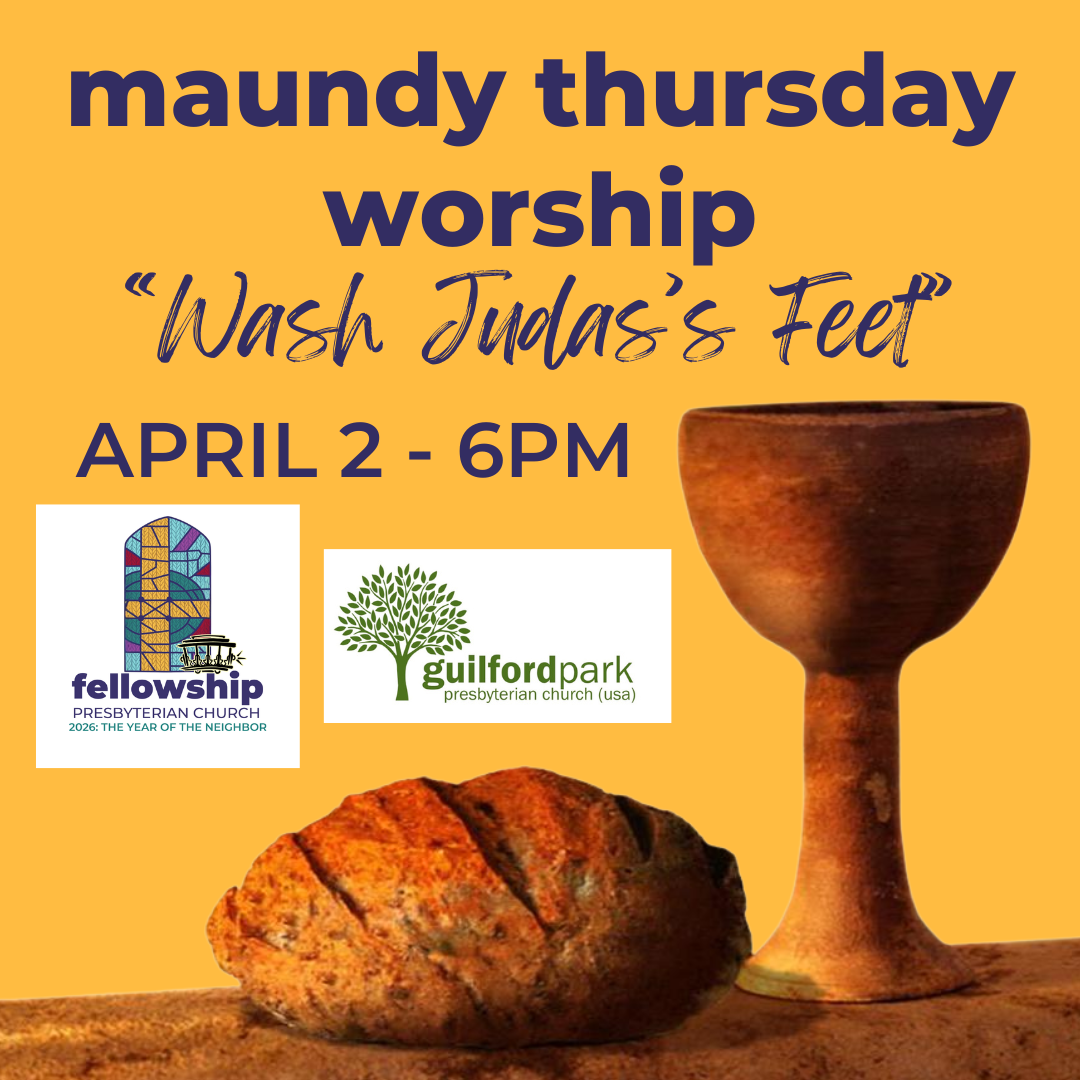 On Maundy Thursday, we continue our Love God, Neighbor, Enemy Sermon Series while worshipping with our friends at Guilford Park Presbyterian Church. This stop in the Holy Week journey will include communion and a symbolic handwashing ritual. Whether in-person or online, join us LIVE on Maundy Thursday for worship at 6pm in the Sanctuary. Professional Childcare is NOT available for this service.