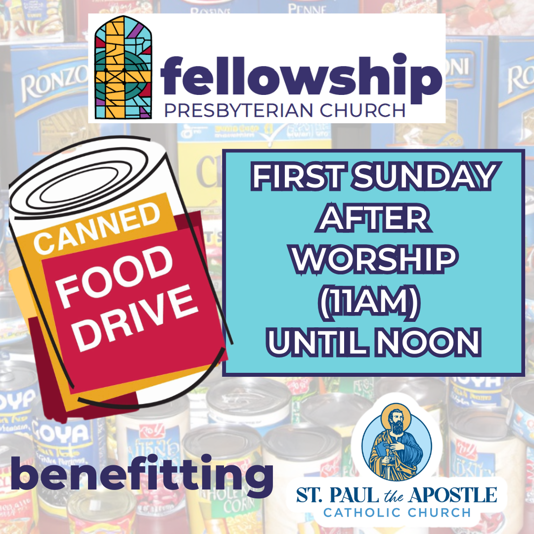 The monthly Food Drive will take place after worship, from 11am-noon. Members of the Mission Ministry Team will be present to collect any nonperishable foods that they will deliver to the Food Pantry at St. Paul the Apostle Catholic Church on your behalf. For more information on the Food Pantry, please click here.