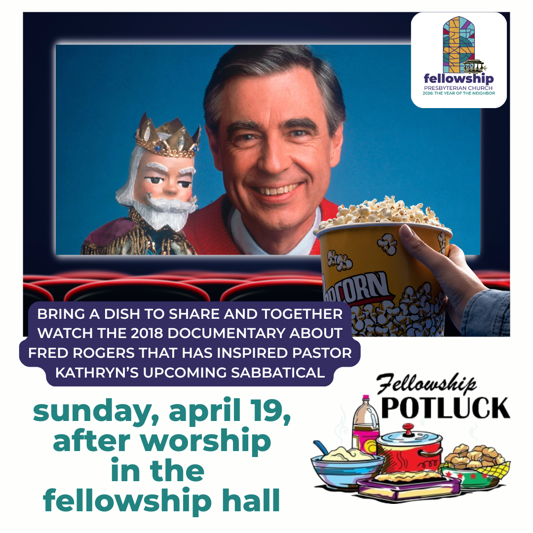All are welcome to the Fellowship Hall after worship to this free event: bring a dish to share for a potluck while watching the 2018 documentary about Fred Rogers that inspired Pastor Kathryn’s upcoming sabbatical. Professional Childcare available for this event.